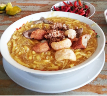 A Batangas version of your favorite lomi where there are no veggies or if there is any, it is only used as garnishing. This is a version lomi created for meat lovers where the most of the ingredients aside from the miki noodles are pork meat, pork liver, pork rind or chicharon, kikiam and fried pork belly for garnishing. But some of these dishes vary in their garnishing like adding squid balls or fish balls on top of the kikiam. I also notice the use of the thickening agent where some use cornstarch and others use cassava starch. But if you want your lomi to have a clear soup (of course the color would be brown because of the soy sauce), use sweet potato starch just like the one used in making maki mi.