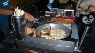 Fish balls in the Philippines are sold by street vendors pushing wooden deep frying carts. The balls are friend then served skewered, and most often offered with a choice of three kinds of dipping sauces: